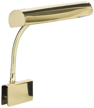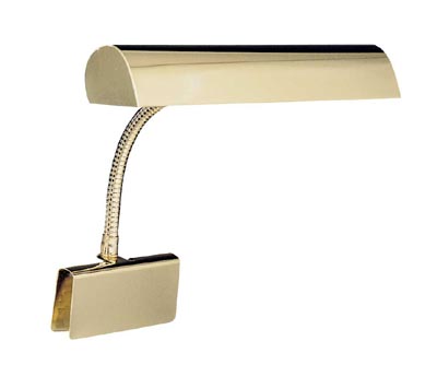 This 14 inch shaded clip on lamp with a 8.5" adjustable gooseneck allows you to place your lamp above your music, and clip onto the stand. Finish Polished Brass, Height Adjustable 8.5" gooseneck, Bulbs Two 40T10 click here for larger image